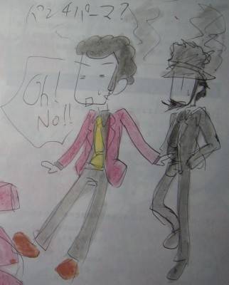 という推測と想像を絵にしてみました(何故かルパンが外人風)